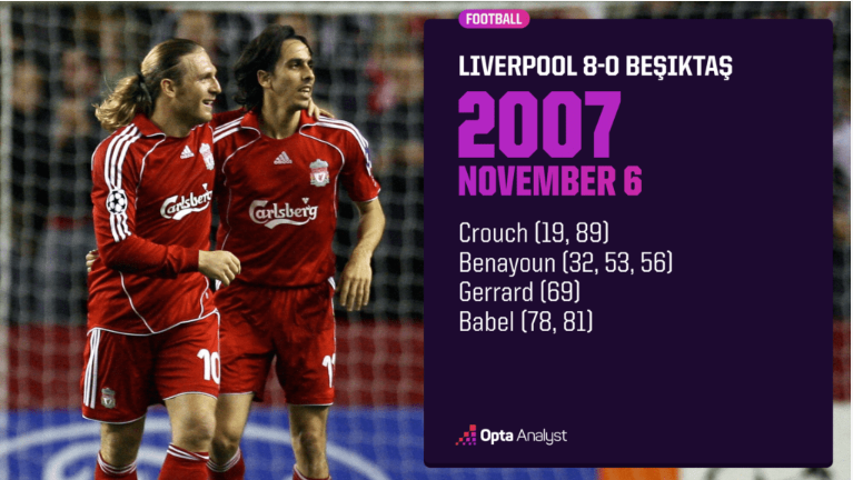 2007年11月,利物浦在安菲尔德球场以8比0大胜土耳其球队贝西克塔斯,成为欧冠历史上首支单场打进8球的球队。