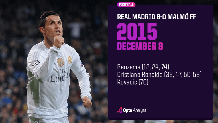 C罗(4球)和本泽马(3球)包办了皇家马德里的7粒进球,这是欧冠历史上唯一一场有两名球员上演帽子戏法的比赛。