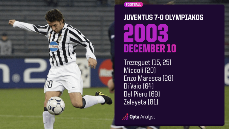 在2003 - 04赛季欧冠小组赛中,尤文图斯在德尔阿尔皮球场以7比0横扫希腊球队奥林匹亚科斯,队中6名不同球员均有进球。