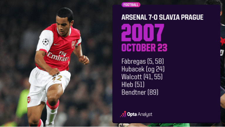 沃尔科特梅开二度,这是他在欧冠的首个两粒进球,他以18岁零221天的年龄成为在欧冠中上演梅开二度最年轻的英格兰球员。