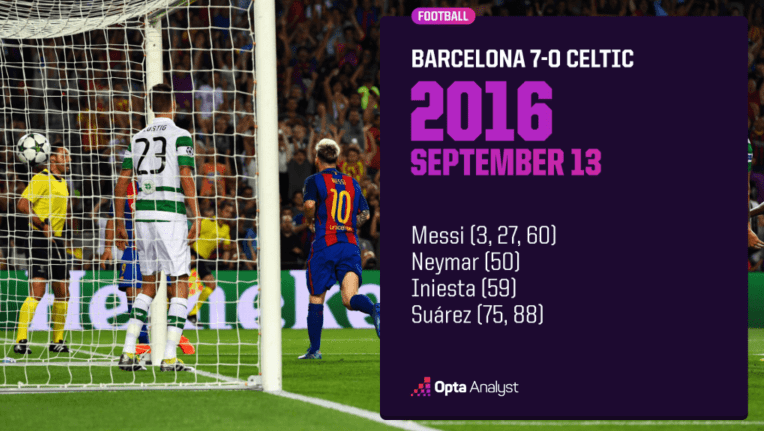 2016年9月,巴塞罗那在诺坎普球场对阵凯尔特人的小组赛中大放异彩。