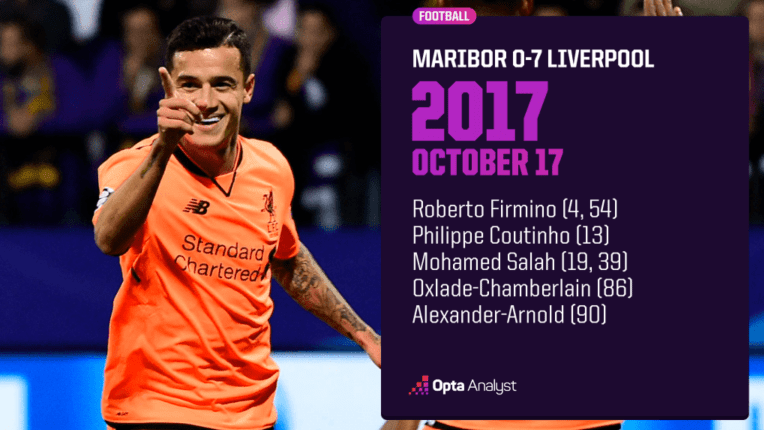 利物浦客场7比0大胜斯洛文尼亚球队马里博尔,这是英格兰球队在欧冠或欧洲冠军杯历史上客场最大比分胜利。