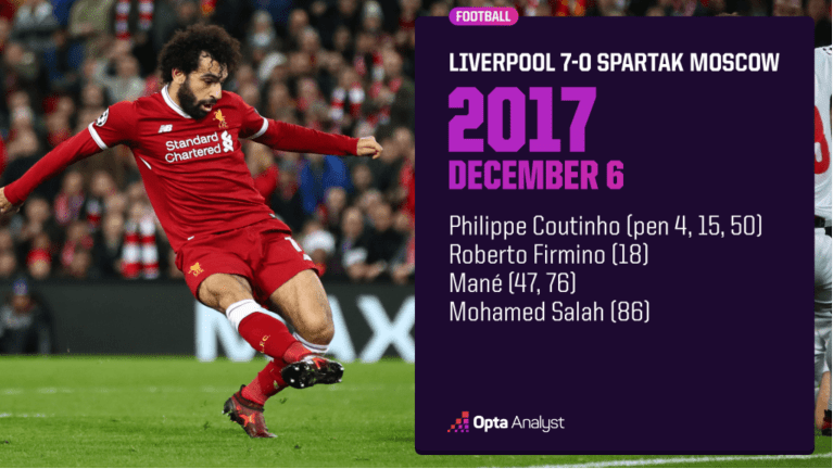 在2017 - 18赛季欧冠小组赛中,利物浦在不到两个月前刚刚在客场取得7比0的胜利,此次又在主场以相同比分大胜莫斯科斯巴达。