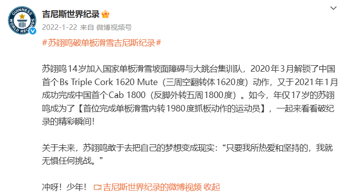 这是苏翊鸣获得的第二个吉尼斯世界纪录认证。此前,他已是“首个完成内转1980抓板动作的运动员”吉尼斯世界纪录保持者。
