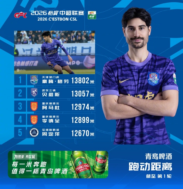 3月11日讯 今日,中超联赛官方公布了首轮联赛跑动榜,津门虎外援豪梅·格劳以13802米的跑动距离居首。