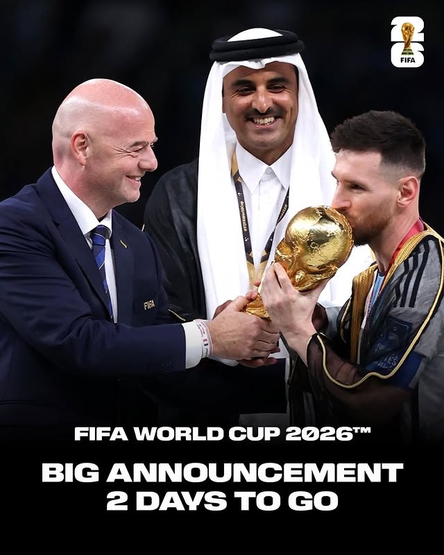 国际足联主席因凡蒂诺更新社媒,晒出梅西在卡塔尔世界杯夺冠后接过大力神杯的图片,并预告两天后会有重大消息宣布。
