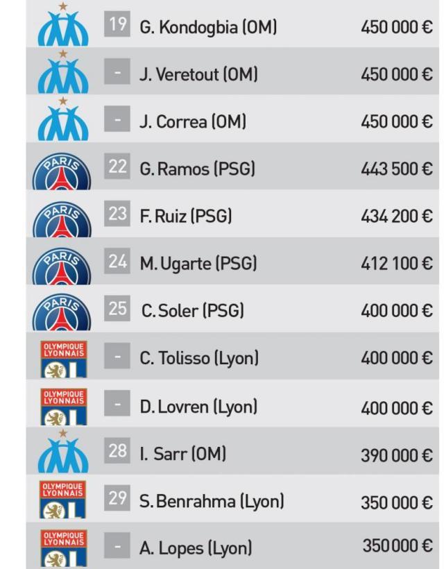 法国权威媒体《队报》公布了最新法甲球员薪水调查报告。巴黎的薪资水平在法甲毫无疑问是独一档的存在,排名前十的球员全被巴黎包揽。梅西和内马尔去夏离队后,姆巴佩成为法甲的“打工皇帝”,月薪600万欧元(税前),第10的穆凯莱为70万,并列第11的是马赛的奥巴梅扬和摩纳哥的本·耶德尔,为65万。