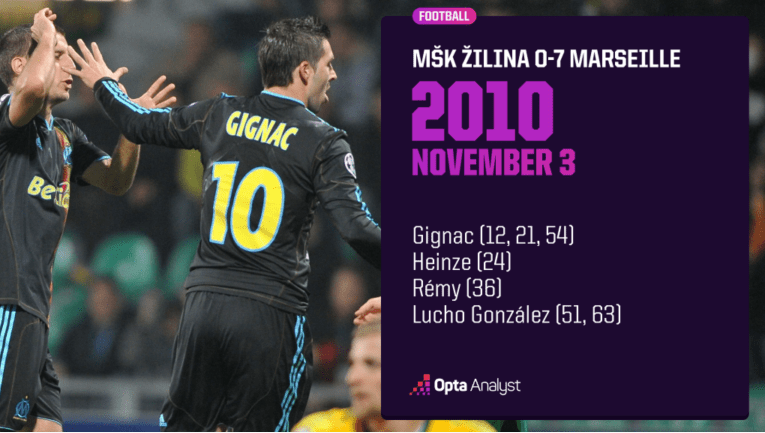 2010年11月,马赛成为首支在欧冠客场比赛中单场打进7球的球队,他们在客场大胜斯洛伐克球队姆什隆达日利纳。