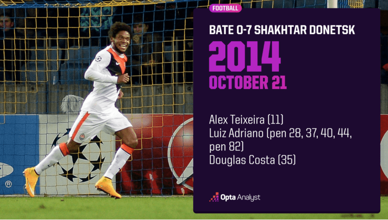路易斯·阿德里亚诺独进4球,下半场又打进1球,完成五子登科,成为继梅西之后第二位在欧冠单场比赛中打进5球的球员。