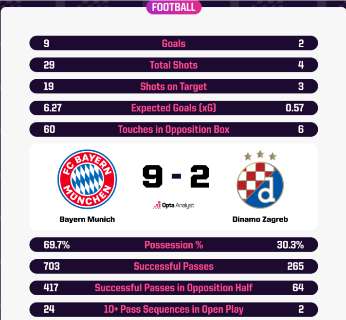 拜仁成为首支在欧冠单场比赛中打进9球的球队,上一次在欧洲冠军杯时代有球队做到这一点是1990年10月皇家马德里9比1大胜瓦克尔因斯布鲁克。