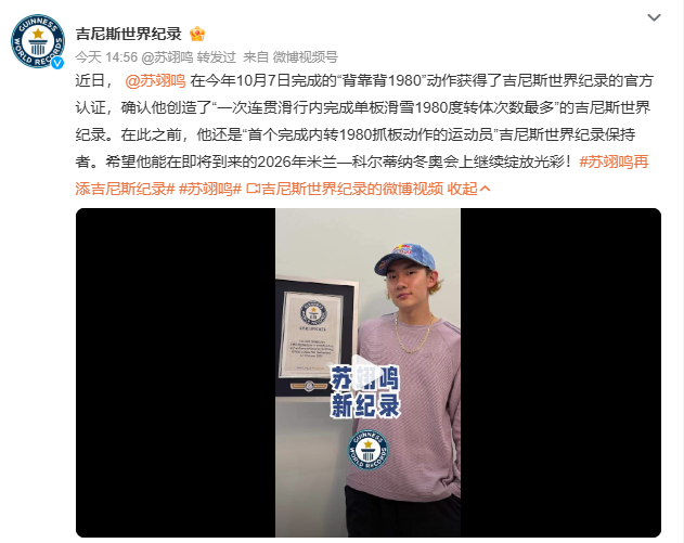 12月25日,吉尼斯世界纪录官方账号发布消息,正式认证了中国单板滑雪运动员苏翊鸣在今年10月7日完成的“背靠背1980”动作,确认他创造了“一次连贯滑行内完成单板滑雪1980度转体次数最多”的吉尼斯世界纪录。