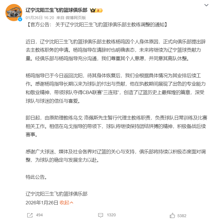 四连败后杨鸣指导辞职,助理教练乌戈暂代主教练。