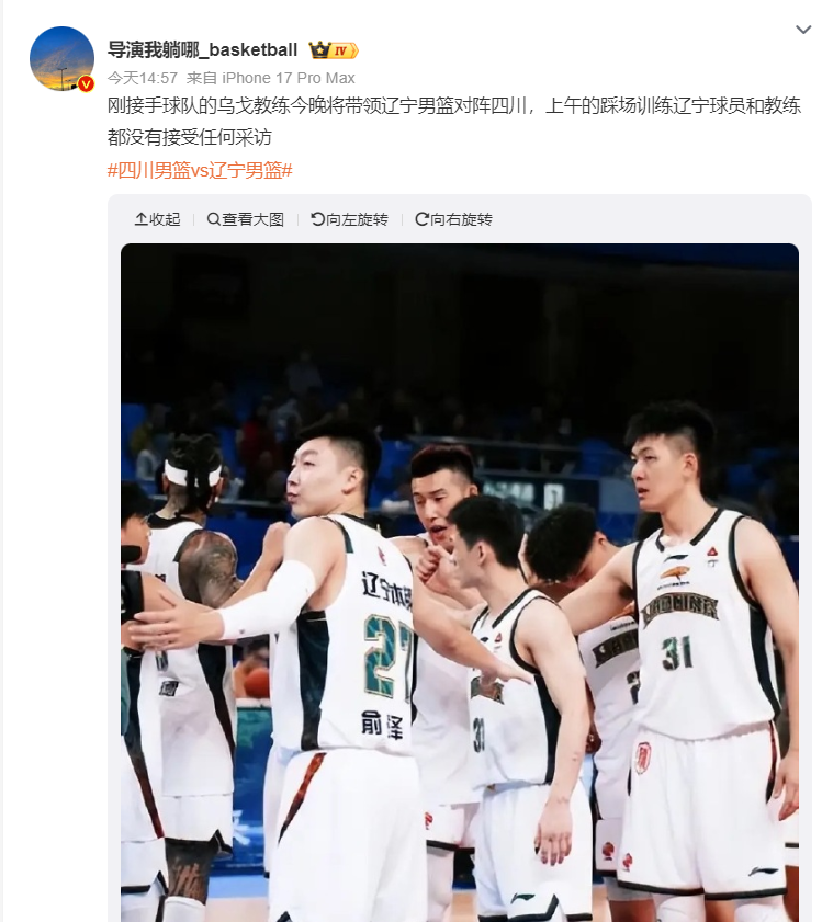 刚接手球队的乌戈教练今晚将带领辽宁男篮对阵四川,上午的踩场训练辽宁球员和教练都没有接受任何采访。