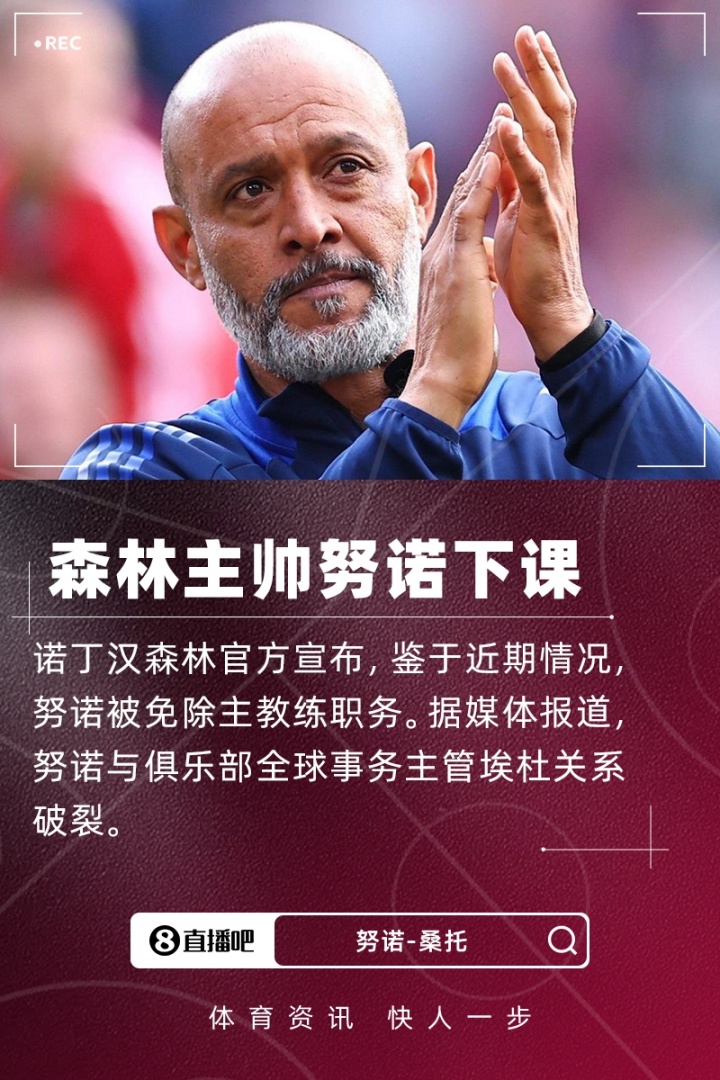诺丁汉森林官方消息,主帅努诺下课!新赛季英超,森林开局1胜1平1负,暂以4分排第10名。据媒体报道,努诺与俱乐部全球事务主管埃杜关系破裂。