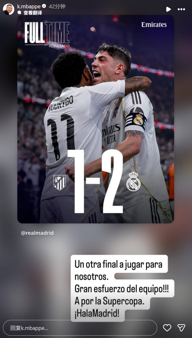 01月 15 2026 0 开云平台-姆巴佩社媒晒海报庆祝球队晋级:让我们拿下西超杯冠军! xiaoqiao 2026-01-15 nba 10 1月9日讯 在西超杯半决赛,皇马2-1击败马竞晋级决赛。本场伤缺的姆巴佩在社媒晒出球队取胜海报,配文写道:“我们还有一场比赛要取胜,全队付出的努力太棒了,让我们拿下西班牙超级杯,皇马加油!”